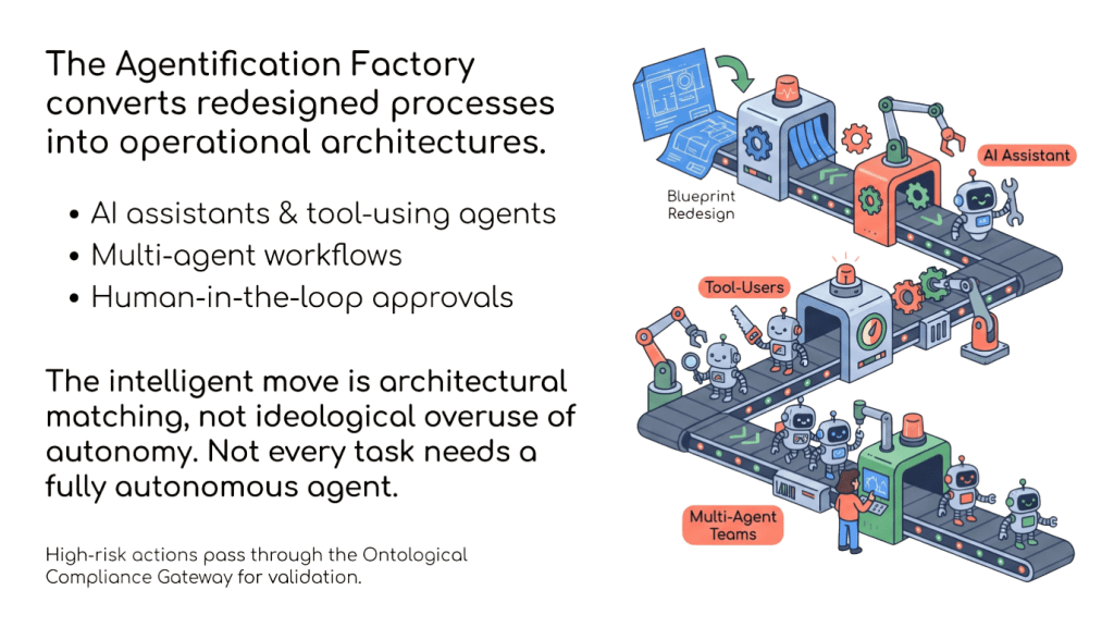 The Agentification Factory converts redesigned processes into operational architectures of AI assistants, tool-using agents, multi-agent workflows, browser automation, human-in-the-loop approvals, and event-driven orchestration. The PADE framework makes clear that not every task needs a fully autonomous agent. The intelligent move is architectural matching, not ideological overuse of autonomy. For complex or high-risk environments, every proposed agent action passes through the Ontological Compliance Gateway, validated for semantic coherence and policy compliance before execution.