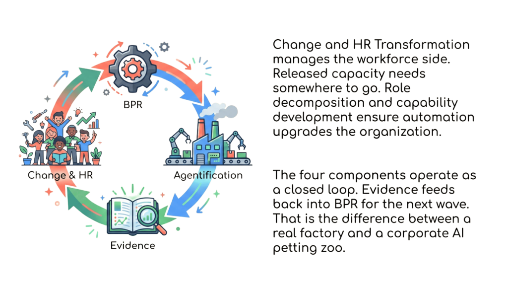 The four components operate as a closed loop. BPR redesigns work. The Agentification Factory converts it into intelligent execution. The Evidence Factory proves value and control. Change and HR evolves the workforce around the new model. Evidence then feeds back into BPR for the next wave. That is the difference between a real factory and a corporate AI petting zoo full of pilots nobody remembers six months later.