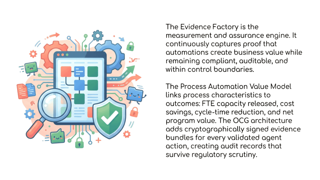 The Evidence Factory is the measurement and assurance engine. It continuously captures proof that automations create business value while remaining compliant, auditable, and within control boundaries. The Process Automation Value Model links process characteristics to outcomes including FTE capacity released, cost savings, cycle-time reduction, and net program value. The OCG architecture adds cryptographically signed evidence bundles for every validated agent action, creating audit records that survive regulatory scrutiny.